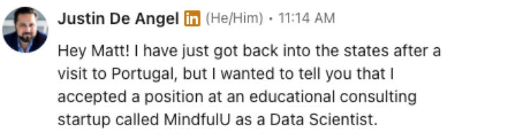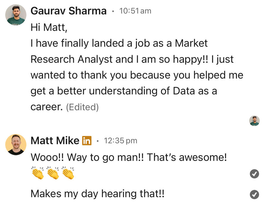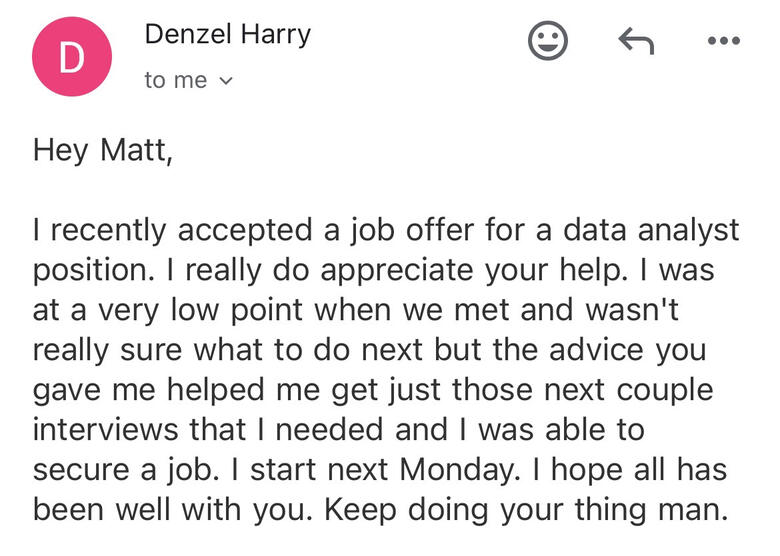 - NetworkingWe spent time on each of these.He put in the work.And a few months later, he landed a 6-figure data analyst job.Zac is one of many clients who have found results working with me.
